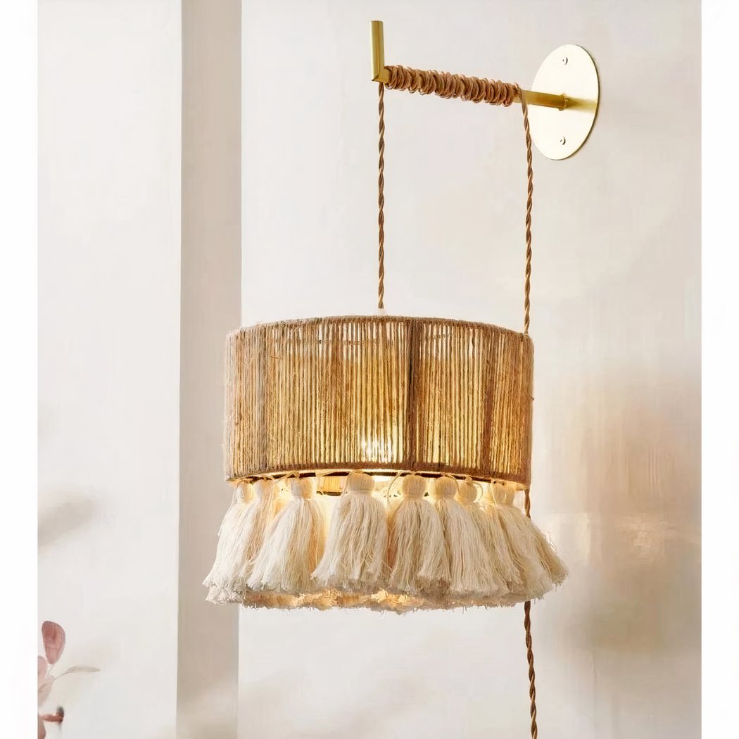 Lleve a su hogar nuestro encantador aplique de mimbre y flecos de estilo bohemio. Inspirada en la estética relajada de este estilo atemporal, esta pieza evoca un auténtico ambiente bohemio. Perfecto para aportar una luz suave y cálida a su espacio, este aplique crea una atmósfera acogedora y relajante.