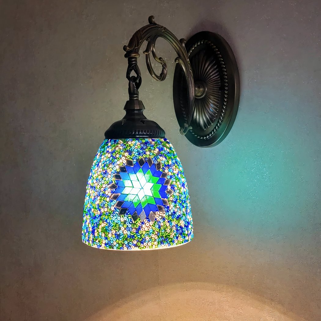 Este aplique de estilo oriental con reflejos azules y mosaicos orientales es una refinada obra de arte que destila elegancia y exotismo. Su pantalla de cristal, adornada con motivos geométricos, ofrece un espectáculo visual hechizante. Elija entre 3 diseños únicos con un sutil toque artesanal para realzar cualquier espacio.