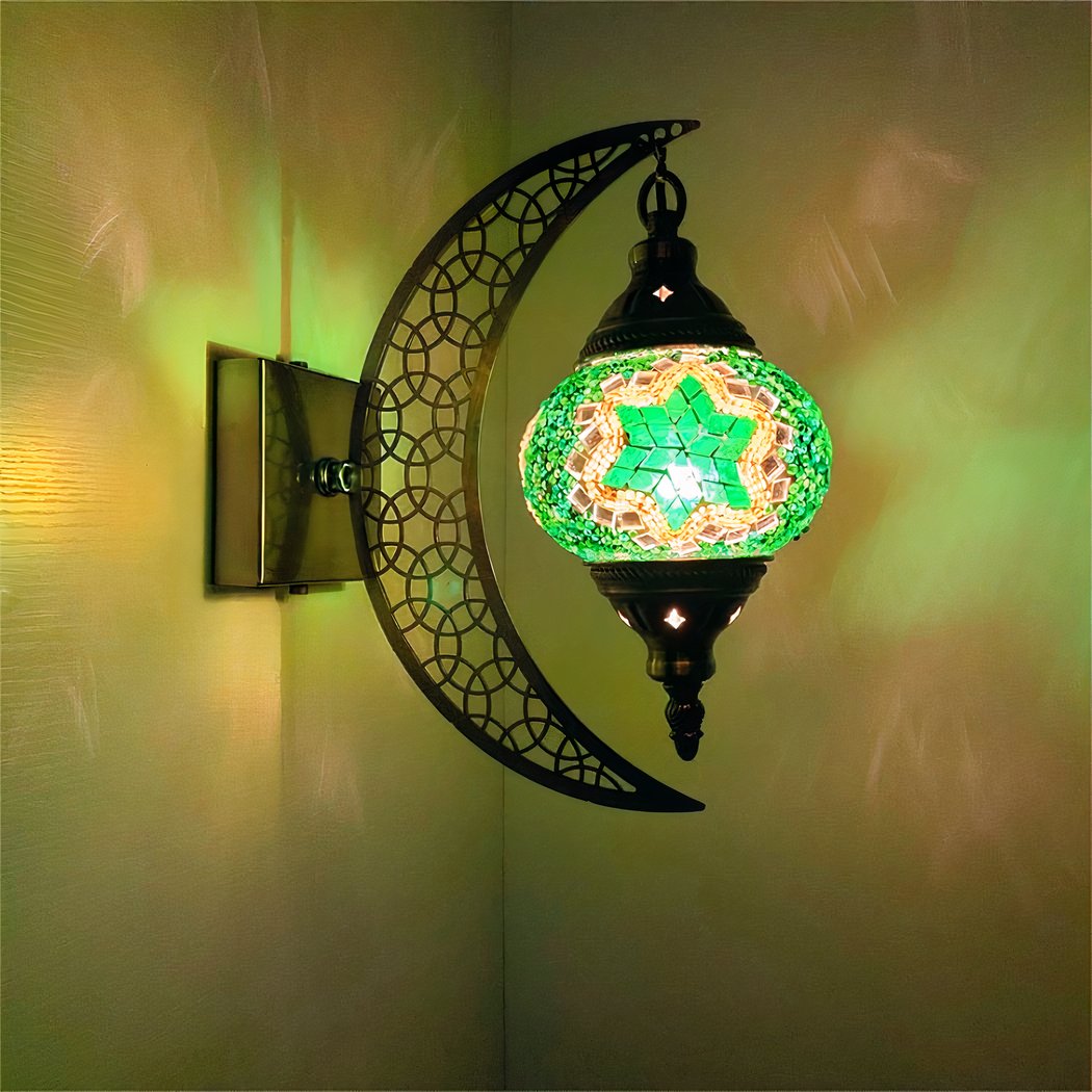 Descubra nuestro encantador aplique luna de estilo oriental, que ofrece un auténtico ambiente mediterráneo. Su pantalla de cristal, delicadamente sujeta por esta media luna, está adornada con magníficos mosaicos, iluminando su espacio con una luz suave y cálida. Añada un toque de elegancia y brillo a su interior con esta pieza única.